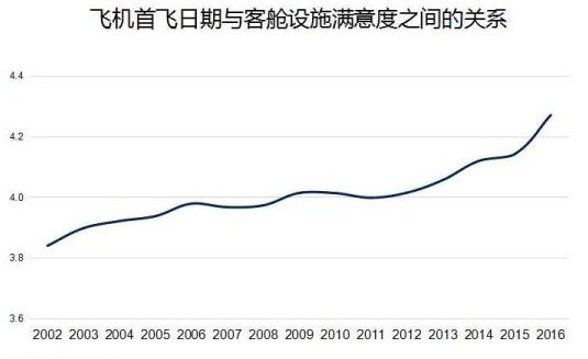 上圖是飛機(jī)首飛日期與客艙設(shè)施滿意度之間的關(guān)系,可以看出首飛日期越近滿意度越高,首飛日期越早滿意度越低,而且是持續(xù)地降低?!耙簿褪钦f我們?nèi)说男枨笤谧兓覀兊酶先说男枨笞兓?。行業(yè)的標(biāo)準(zhǔn)是持續(xù)的在升級的,我們需要往前追趕?!?